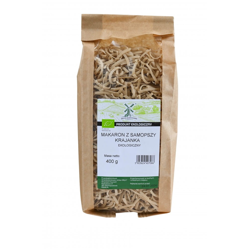 Makaron robi się z ekologicznej jasnej mąki z samopszy. Do uprawy nie wykorzystuje się żadnych nawozów sztucznych i oprysków chemicznych. Makaron z samopszy jest produkowany domowymi sposobami, według sprawdzonych receptur. Makaron pochodzi bezpośrednio z gospodarstwa ekologicznego w naszej okolicy. Rolnicy sami uprawiają ziarno i zajmują się produkcją makaronu.