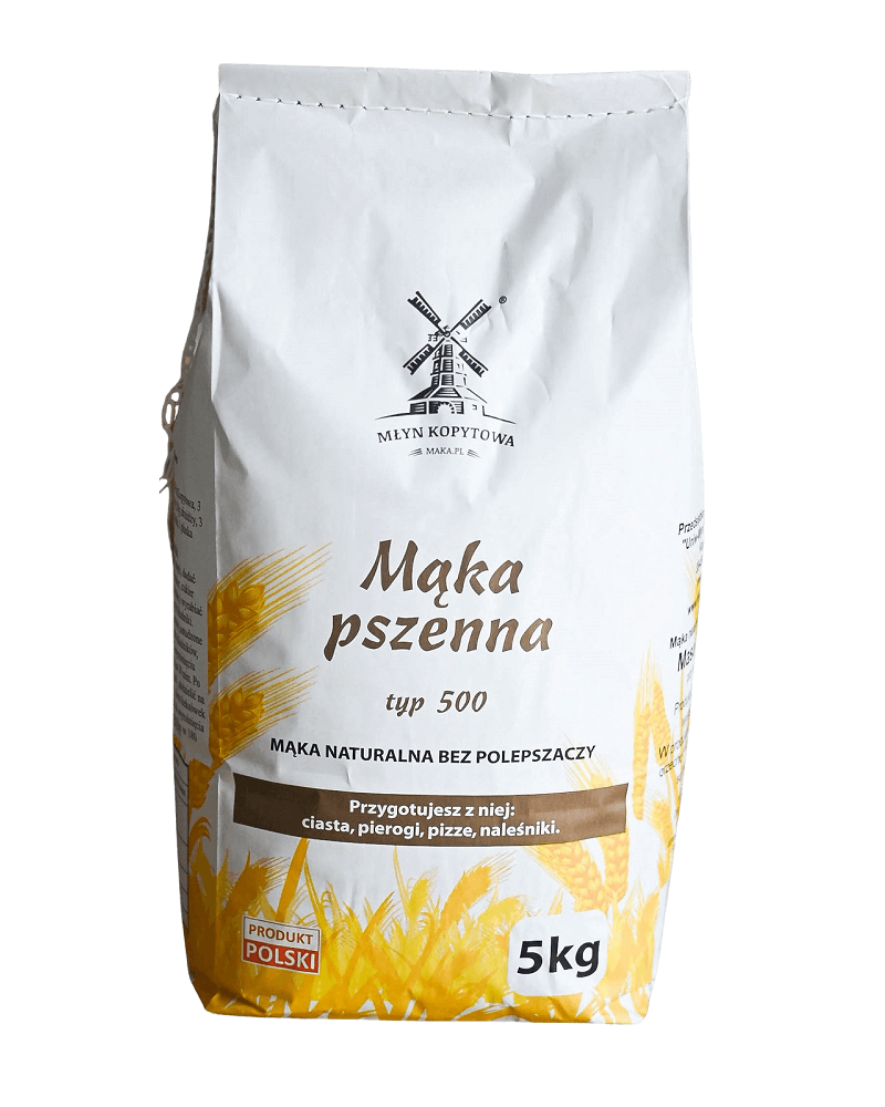 Mąka pszenna typ 500 jest wytwarzana tradycyjnymi metodami z ziarna pszenicy pozyskanego z lokalnych gospodarstw rolnych. Jest to najpopularniejsza mąka w Polsce. W naszym młynie do żadnego produktu nie dodajemy żadnych dodatków, polepszaczy czy wybielaczy. Mąka jest naturalna, niestandaryzowana. Dlatego w zależności od partii ziarna barwa mąki, wartości odżywcze, zawartość glutenu czy chłonność wody może się od siebie różnić.
