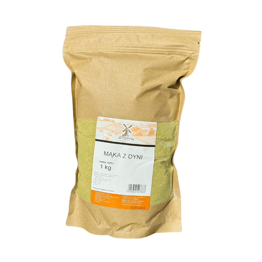 Pestki dyni od dawna są uważane za źródło zdrowych tłuszczów i antyoksydantów. Warto wiedzieć, że sama mąka to w pewnym sensie produkt uboczny powstający po wytłoczeniu oleju. Następnie wyciśnięte pestki dyni przerabia się na mąkę, drobno je mieląc. Mąka z dyni gwarantuje bardzo dużą ilość białka, dzięki czemu jest dobrą alternatywą dla produktów pochodzenia zwierzęcego. Znajdziemy w niej również dużą ilość minerałów, witamin oraz kwasów tłuszczowych. Jest delikatnie zielona. W naszej ofercie znajdziesz również pestki dyni z Polski. Sprawdź również inne mąki niezawierające naturalnie glutenu.
