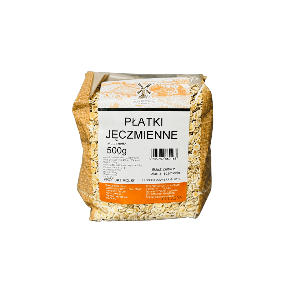 - Błonnik - Twój sprzymierzeniec w zdrowiu: Wysoka zawartość błonnika pokarmowego to klucz do prawidłowej pracy układu pokarmowego. Płatki jęczmienne regulują perystaltykę jelit, zapobiegają zaparciom, wspomagają detoksykację organizmu i utrzymują uczucie sytości na dłużej.