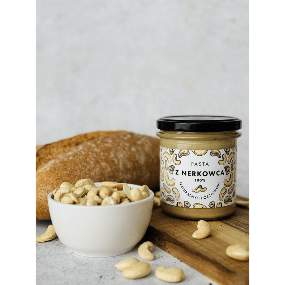 Pasta z nerkowca to delikatny, kremowy produkt, który zachwyci swoim łagodnym, lekko słodkim smakiem. Stworzona z najwyższej jakości orzechów nerkowca, bez żadnych dodatków, takich jak cukier, sól czy olej palmowy. Orzechy nerkowca są delikatnie prażone, a następnie mielone na gładką pastę, która idealnie rozprowadza się na pieczywie i doskonale komponuje z różnymi potrawami. Jest najsłodsza ze wszystkich past orzechowych. Pasta z nerkowca to naturalna i zdrowa alternatywa dla kremów pełnych sztucznych składników, idealna dla osób dbających o zdrowy styl życia. Sprawdź również inne pasty orzechowe w naszej ofercie.