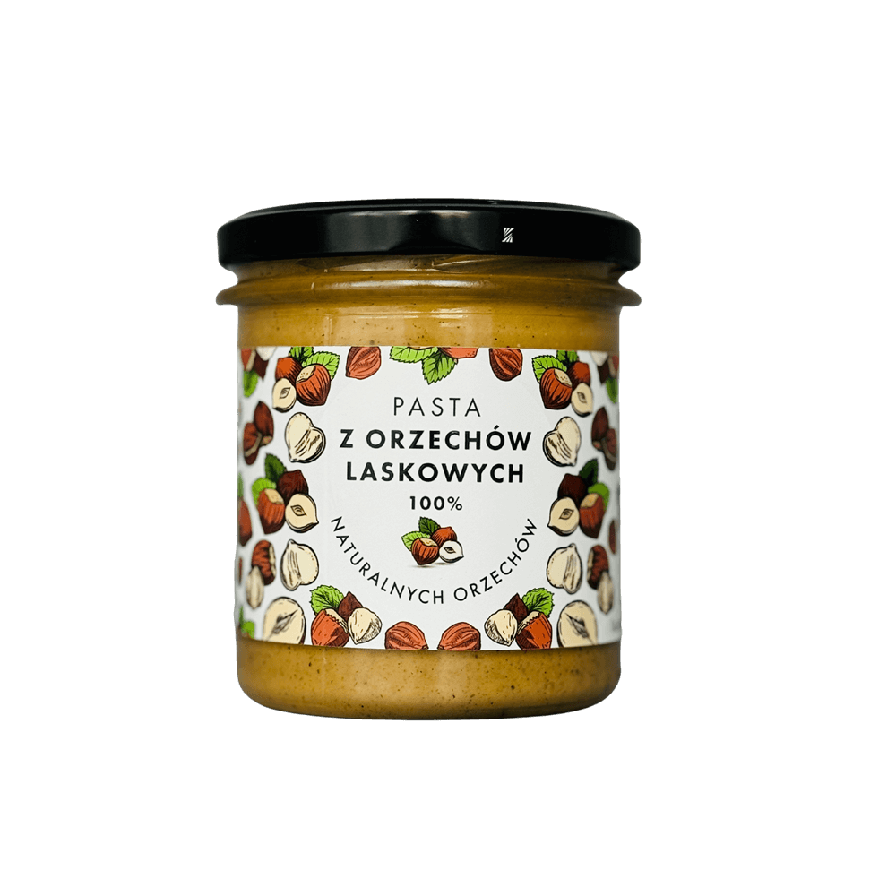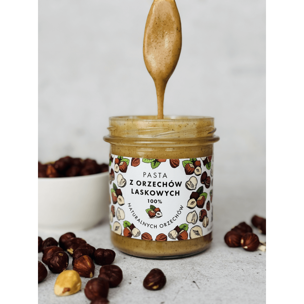 Pasta z orzechów laskowych to wyjątkowy produkt o intensywnym, naturalnym smaku, który zachwyca swoją kremową konsystencją. Wytwarzana wyłącznie z prażonych orzechów laskowych, bez dodatku cukru, soli czy oleju palmowego, jest zdrową alternatywą dla przetworzonych produktów dostępnych w sklepach. Idealnie nadaje się do codziennego użytku w kuchni, dostarczając cennych składników odżywczych i wzbogacając potrawy swoim głębokim, orzechowym smakiem. Sprawdź także inne pasty orzechowe w naszej ofercie!