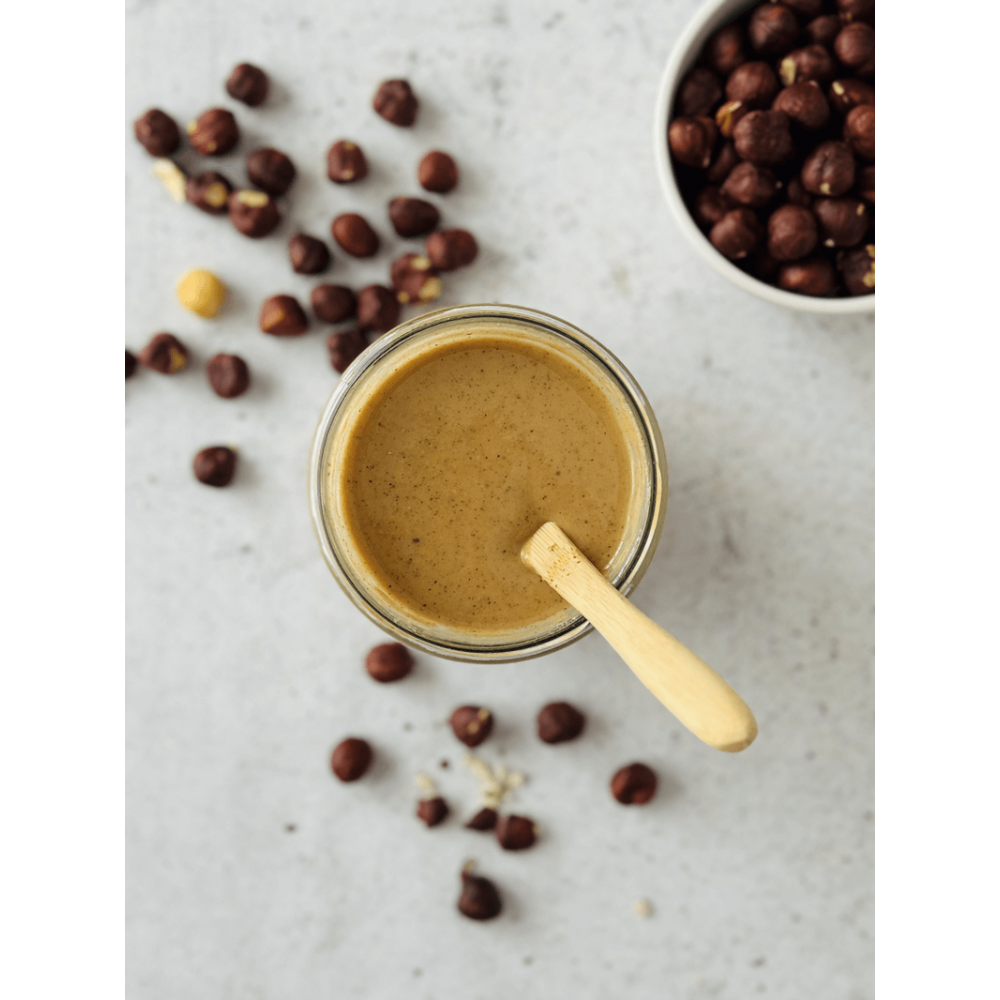 Orzechy laskowe są niezwykle bogate w wartości odżywcze. Pasta z orzechów laskowych dostarcza zdrowych tłuszczów nienasyconych, które wspomagają pracę serca, oraz białka roślinnego, które jest ważne dla budowy i regeneracji mięśni. Jest także źródłem błonnika, który wspiera trawienie, a także witaminy E, witamin z grupy B, magnezu, żelaza i potasu, które wspierają prawidłowe funkcjonowanie układu nerwowego oraz dbają o zdrową skórę i włosy.